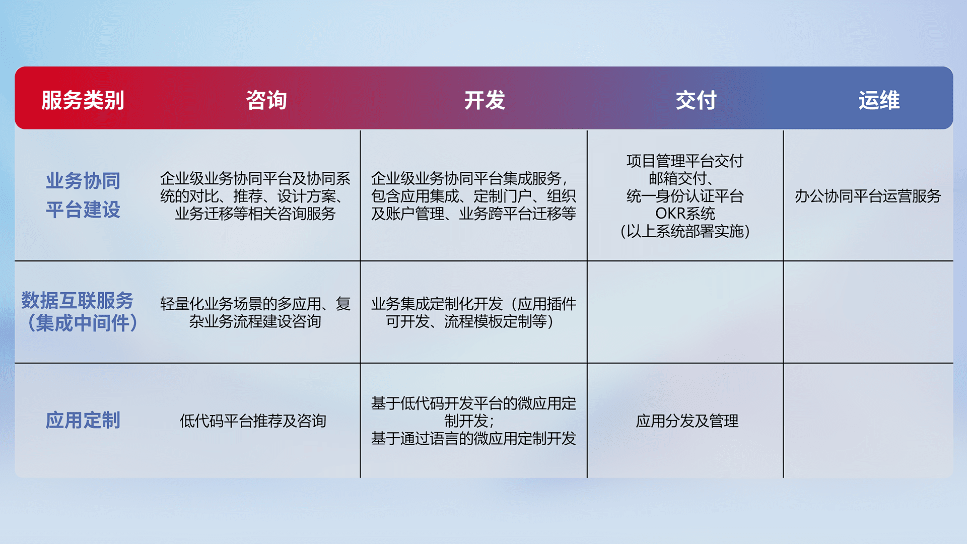 针对钉钉、、企微、、、、IDaas等平台级产品提供产品的规划、、、方案、、、、交付、、、定制化开发等服务,,实现如统一协同办公、、智能客户服务、、、混合会议管理、、、、智能数据查询、、、、等业务场景,,,实现数字化转型。。